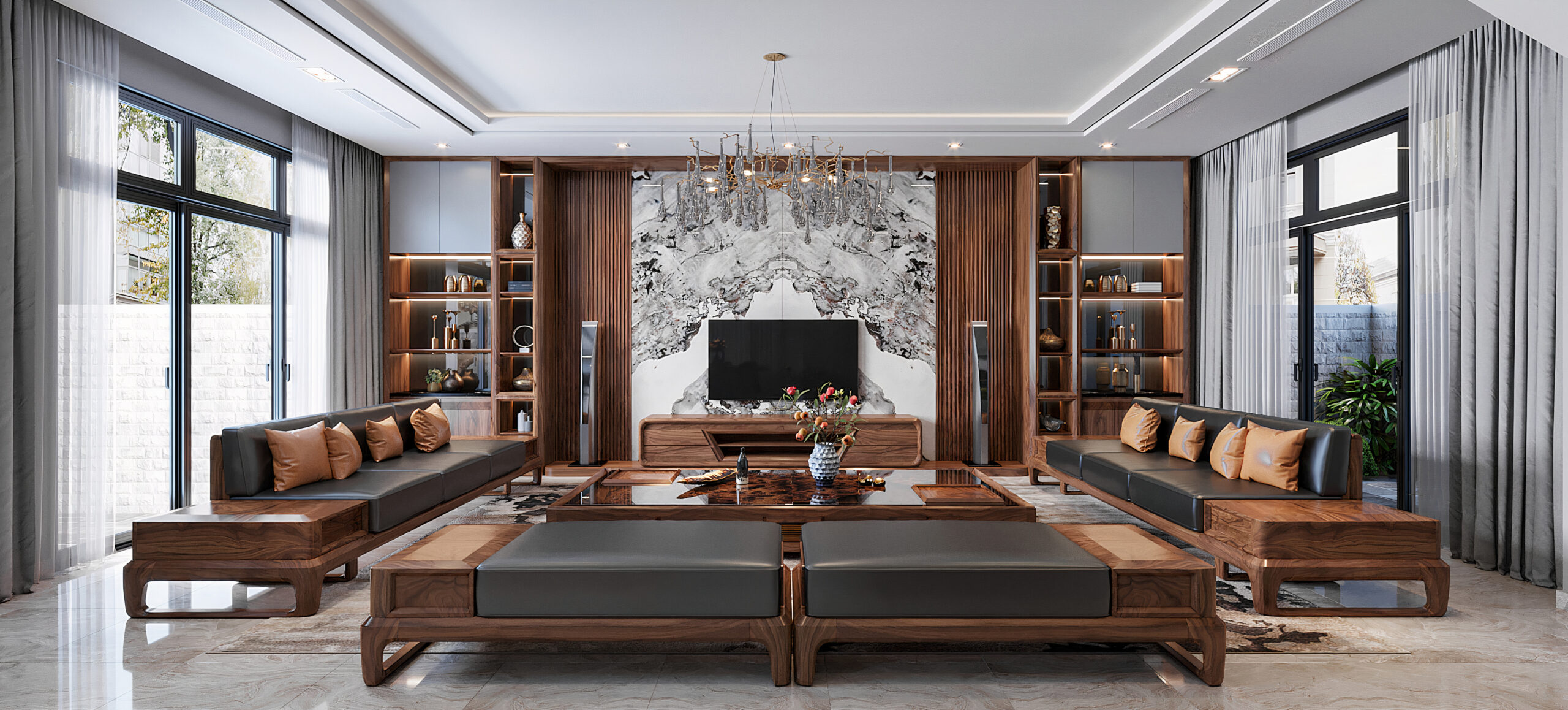 Kết hợp yếu tố Việt Nam như tre nứa với kính và kim loại, mẫu này mang thiên nhiên vào nhà qua cây xanh và họa tiết lá nhiệt đới.